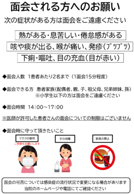 感染対策のため入院患者さんとの面会は次のとおりとなります。ご協力のほどよろしくお願い申し上げます。