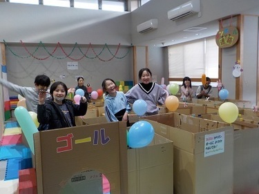 今回で2回目の開催となりましたが、昨年とはコースも変え、また2週目にはのれんで目隠しをして難易度をあげ、繰り返し挑戦してもらいました。幼児には難しいかと思われましたが「どこ〜?」など楽しむ様子が見られ、クッションマットの上を上手にハイハイして段ボールの隙間を潜り抜け、みんな笑顔でゴールにたどりついていました。