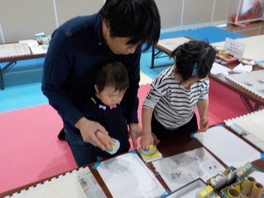 また、お父さんに手を添えてもらいながら狙った場所に上手に押せると嬉しそうにする幼児の姿や、お母さんに相談しながら配置や配色にこだわる小学生の姿も製作中に見られ、親子でのコミュニケーションを楽しむ時間となりました。