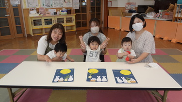 絵本を見ながらお月見のことや、お月さまにはうさぎがいる?など話をしてから制作に取り組みました。0歳から2歳の参加なので、制作はほぼお母さんでした。しかし、今回参加しているお母さんの素晴らしいところは・・・・・・。子どもが小さくても手を取りながら一緒にシールを貼ったり、ペンを持って描いたり、一人ではできないことを親と一緒に経験をさせているところでした。できないと決めつけるのではなく、一緒に取り組むことで、指先の発達や親子で完成させる達成感、一緒に楽しく取り組むことで愛情を感じられる絆づくり等々たくさんの効果が期待できます。実際に、ほぼ毎回制作等の行事に参加しているお子さんは、細かなシールを1人で剥がし、画用紙に自分で貼り付けたり、好きな色ペンを次々と使いながら描いたりすることができているお子さんもいます。集中できる時間が長くなっていて、今回も素敵な作品を完成させて嬉しそうにしていました。