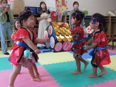 首に下げた筒状のサイフからチケットを出して「これください。」「ありがとう。」などの会話やペコリと頭を下げる動作さも見られ、微笑ましく感じました。買い物を楽しんだり、クレープやラーメンを食べたりとごっこ遊びも上手にできていました。また、カラーポリ袋で作っておいた《赤いハッピ》《はちまき》《腰ひも》なども嫌がらずに全員身に着けて、おみこしを交代しながらかつぎました。「ワッショイ!ワッショイ!」と、ママ達はアンパンマンうちわで応援!携帯での撮影もバッチリでしたか。