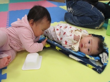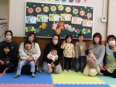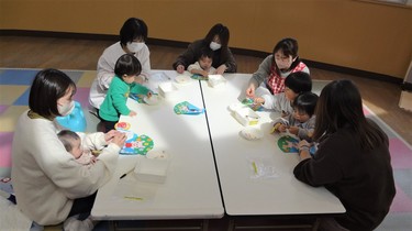 子どもが好きなシールを選んで、自由に模様付けを楽しんでいました。隣で温かく見守っている保護者の皆さんの姿が印象的でした。4人の子ども達は4月から幼稚園入園。たくましくなったなあと、写真からも身長・体重からも制作活動からもたくさん感じた日でした。0歳の2人も保護者の膝の上で、参加できたこと、とても嬉しく感じました。
